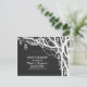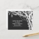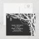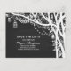 kreative Tafel Save the Date Postkarte mit Maurerkirschen, Tinkelleuchten, Blume, Blätter und Bäumen. Ideal Save the Date für Hochzeiten im Freien mit Bäumen und Hängekerzenleuchten.