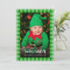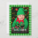 In einem karierten, grünen Rahmen (Gingham) befindet sich ein Foto eines Babys, das als Helferelf des Weihnachtsmannes gekleidet ist, vor einem Weihnachtsbaum, umgeben von verschwommenen Lichtern und Baubles. Im unteren Teil werden die Worte "Der Niedlichste Elf des Weihnachtsmannes" in einem großen weißen Schriftsatz geschrieben, und die Erholung der Nachricht in kleinen weißen Kappen. Auf der Rückseite ist nur grüner Gingham kariert. Das Foto eines als Elf gekleideten Babys, vor einem Weihnachtsbaum, ist von Petr Kratochvil von Public Domain Pictures und es hat Modellfreigabe.