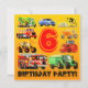 Neun farbenfrohe LKWs umgeben eine Zahl 6. Ein grüner und gelber Zementmischer, blauer LKW, gelber Bulldozer, orangefarbener Müller, rote Straßenwalze, grüner Traktor und Anhänger, Feuerwehrwagen, gelber Grabmesser und ein Bauer! Alle Arten von Bautransport, die großen LKW, die Kinder Liebe! Perfekt für Ihren Feuerwehrwagen, Bagger, LKW oder Traktor, der 6 Jahre alt ist, am 6. Geburtstag. Wunderbar für Ihr 6-jähriges Party.