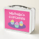 Kid's Lunch Box mit niedlichem Tasse Kuchen Druck. Retro Stil Metall Lunch Box mit Namen des Kindes. Personalisierte Geschenkideen für kleine Mädchen, die in den Kindergarten und die Vorschule gehen. Alte Schule glänzende metallische Lunchbox mit Griff. Niedliche Geburtstag oder Holiday Geschenkidee für Enkelin, Tochter, Cousin etc. Fügen Sie Ihren eigenen Namen, Monogramm-Initialen oder lustiges Zitat hinzu. Süße Leckereien zeichnend. Erhältlich in Rosa und anderen Farben.