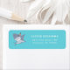 Niedliches Rücksendelabel mit einer Darstellung eines Hais mit einem Lächeln und einem Party auf blauem Hintergrund. Ideal für eine Geburtstagsfeier zum Thema Hai.