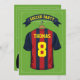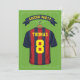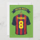 Fußball-Geburtstagsfeier mit grünem Fußballplatz, bordeauxrotes und blau gestreiftes Shirt mit Namen und Nummer, Fußball und modernes Party.