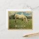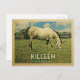 Killeen Texas ländliche Vintage Reise Postkarte. Es zeigt ein weißes Pferd Weiden auf grünem Gras mit Zaun und blauen Wolken Himmel oben. Ein lustiges Landwirtschaftsimage mit rustikalem Charme.