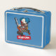 A crazy clown on a metal lunch box. Use "Personalize this template" to tweak the "KILLER CLOWN" text and create a unique, customized item. Featuring a blue haired clown character with red nose and striped outfit carrying an orange chainsaw. A villain in the tradition of horror films and Halloween.