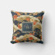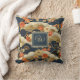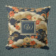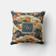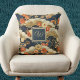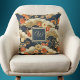 This retro look throw pillow features a Japanese style print -- similar to patterns from kimonos -- with white, teal, tan, and orange on dark teal-- almost black. Your name monogram initial appears in gold text on a coordinated color block of dark blue teal, bordered in gold. This kimono style Asian print pillow makes a lovely accent for your home or a gift for a housewarming, or a friend or loved one.