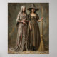 Zwei Frauen stehen nebeneinander und rufen eine magische Aura hervor. Eine Frau trägt ein langes Kleid und einen Hexenhut, hält einen Besen, während die andere ein gealtertes, mysteriöses Aussehen hat, das in einen Kapuzenmantel gehüllt ist. Eine kleine schwarze Katze sitzt zwischen ihnen und verstärkt die mystische Atmosphäre.