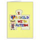 Ein großes Puzzlespielstück, ein Herz, das aus Puzzlespielstücken bestehen, ein brünettes behaartes Mädchen des Strichmännchens und Text, der "mich Liebe ein Kind mit Autismus" auf Autismusbewusstsein T-Shirts, Becher, Karten liest, Aufkleber, Tasche bauscht sich, Magneten, keychains, Zeitschriften, mousepads und andere Kleider- und Geschenkeinzelteile.