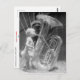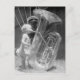 Das ist ein Vintages Foto eines kleinen Kindes, das in das Mundstück einer Tuba weht, ein Instrument, das viel größer ist als das Kind.