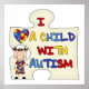 Ein großes Puzzleteil, ein aus Puzzleteilen bestehendes Herz, ein brünettes Strichmännchen-Haarmädchen und ein Text, der auf T - Shirt, Tasse, Karten, Aufklebern, Totensäcken, Magneten, Schlüsselanhängern, Zeitschriften, Mousepads und anderen Bekleidungsstücken und Geschenkartikeln "I Liebe a Child With Autismus" steht.