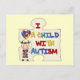Ein großes Puzzleteil, ein aus Puzzleteilen bestehendes Herz, ein brünettes Strichmännchen-Haarmädchen und ein Text, der auf T - Shirt, Tasse, Karten, Aufklebern, Totensäcken, Magneten, Schlüsselanhängern, Zeitschriften, Mousepads und anderen Bekleidungsstücken und Geschenkartikeln "I Liebe a Child With Autismus" steht.