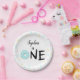 Geburtstagpapierplatte für ein Krapfenthema-Geburtstags-Party, das Krapfen mit tadelloser Glasur kennzeichnet. Der Text sagt, dass "EINER" mit einem Krapfen, der die Stelle für den Buchstaben "O." Sie ausfüllt, dieses Einzelteil besonders anfertigen kann, indem es den Namen Ihr Kindes an der Spitze addiert.