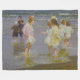 Dieses Design zeigt ein Gemälde des amerikanischen Impressionisten Edward Henry Potthast (1857-1927). Es zeigt eine Gruppe von Kindern, die im Wasser spazieren gehen, während die Wellen an einem Strand an der Ostküste der USA gegen die Füße stoßen. Die Szene könnte Brighton Beach in New York City sein, wo Potthast oft zum Malen kam. Die Jungs tragen Hosen und die Mädchen heben ihre Kleider auf, damit ihre Kleider nicht nass werden. Die Mädchen tragen Bogen im Haar. Es gibt auch eine Frau mit ihrem Sohn im Hintergrund. Jeder amüsiert sich am Strand in dieser Vintagen Szene des amerikanischen Lebens. Das Originalwerk wurde 1920 von E.H. Potthast gemalt.