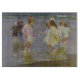 Dieses Design zeigt ein Gemälde des amerikanischen Impressionisten Edward Henry Potthast (1857-1927). Es zeigt eine Gruppe von Kindern, die im Wasser spazieren gehen, während die Wellen an einem Strand an der Ostküste der USA gegen die Füße stoßen. Die Szene könnte Brighton Beach in New York City sein, wo Potthast oft zum Malen kam. Die Jungs tragen Hosen und die Mädchen heben ihre Kleider auf, damit ihre Kleider nicht nass werden. Die Mädchen tragen Bogen im Haar. Es gibt auch eine Frau mit ihrem Sohn im Hintergrund. Jeder amüsiert sich am Strand in dieser Vintagen Szene des amerikanischen Lebens. Das Originalwerk wurde 1920 von E.H. Potthast gemalt.