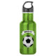 Fußball-Wasserflasche mit üppig grünem Hintergrund, Fußballplatz, Fußball und personalisiertem Namensschild in weißem Banner.