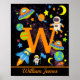 Ein fabelhaftes bunter personalisiertes Weltraumposter für ein Kinderzimmer. Mit Astronauten, Raketenschiff-Außerirdischen und Planeten mit einem Milchstraßenfoto-Hintergrund. Ideal für Jungen Schlafzimmerdekoration oder als Kinderzimmer. Personalisieren Sie durch Änderung des Namens und des Initials.