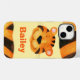 Ein mutiger, farbenfroher Kids-Tiger sieht sich einem Handy-Gehäuse gegenüber, das aus einem Original-Gemälde von Sarah Trett stammt. Ein niedlicher Tigerkoffer für Katzenliebhaber. Personalisieren Sie mit dem Namen Ihrer Wahl, derzeit liest Bailey.