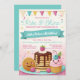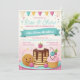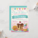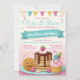 Die Einladung hat ein Frühstücksthema, illustriert von einem glücklichen Pfannkuchelstapel mit einem Butterkrug und Sirup darüber, neben einem fröhlichen Kuchen mit einem Schwirl aus rosa Eis und einer Kirsche. Die Farbe ist weich und pastellfarben, in Rosa, Blau und Gelb gehalten, die obere Hälfte hellblau mit subtilen Polka-Punkten und die untere Hälfte rosa. Party-Elemente wie Konfetti und Party-Hüte sind verstreut, was auf eine feierliche Stimmung hindeutet. Die Grafiken sind kartoonisch und freundlich, um einen kinderfreundlichen Event anzusprechen. Das Gesamtdesign vermittelt Freude und Morgenfest.