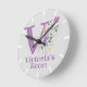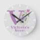 Das Design bietet Monogram & Name mit Blume beiderseits in einem pastellfarbenen Aquarell-Stil. Beispielname ist Victoria. Kinder Schlafzimmeruhr. Ändern Sie den Namen nach Wunsch für jeden mit einem Namen, der mit V beginnt.