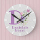 Kinder Schlafzimmer Uhr. Das Design bietet Monogram & Name mit Blume beiderseits in einem pastellfarbenen Aquarell-Stil. Beispielname ist Daniela. Ändern Sie den Namen nach Wunsch für jeden, der einen Namen hat, der mit D beginnt.