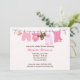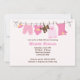Diese niedliche Baby-Dusche lädt mit rosa Babybekleidung und einem Teddybär und einer Babydecke auf einer Wäscheleine ein. Diese moderne und elegante Duscheinladung ist perfekt für jede Mutter. Einige Elemente dieser Karte © BabyStar Design
