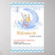 Ein modernes Babyduschdesign mit Aquarellbildern eines Babyelefanten, der auf dem Mond sitzt, mit Leuchtturm, Segelboot, Wolken und Starts. Dieses niedliche Design wird Ihnen eine unterhaltsame Ergänzung zu Ihrer Wassermassage-Babydusche sein.