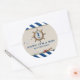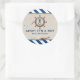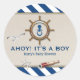 Babyduschen zum Thema Nautik sind eine lustige Möglichkeit, die Mutter-zu-sein-Mutter zu feiern. Dieser Aufkleber weist einen marineblau gestreiften Hintergrund mit einer sandfarbenen Textur auf, die mit einem Seilrücken verbunden ist. Ein Schiffsrad ist der Brennpunkt an der Spitze, aber es umkreist den Schnuller eines Babys. Eine spezielle Nachricht druckt darunter mit Bildern eines Teleskops, Seegras und Seestern in seiner Nähe. Perfekt als Gefälligkeitstags oder als Kuchen Topper. Verfügbar mit passenden Produkten. com