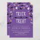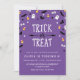 Niedliche, spukhafte lila halloween party Einladungen mit Gespensterkonfetti, Augapfel, Süßmais, Fledermäuse und Hexenschuhen & Besen. Der handgeschriebene Typografie-Trick oder -Treat ist von den Konfetti umgeben; unten steht der personalisierte Party Einladung-Text. Leicht strukturierter Hintergrund - Sie können sogar die Hintergrundfarbe selbst ändern, indem Sie das Tool Anpassen / Anpassen verwenden. Perfekt als Halloween-Party Einladungen auch!