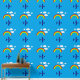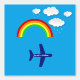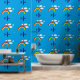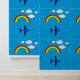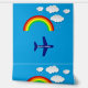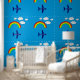 Farbenfrohe, blaue Tapete aus dem Kinderzimmer mit einer Grafik von Wolken, Regenbögen und einem personalisierten Flugzeug. Personalisieren Sie das Textfeld für das Bett oder das Bad Ihres Kindes. Ideal für den Einsatz als Rahmen oder Vollwand.