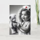 Ein junges Mädchen mit lockigen Haaren und eine Krankenschwester, die spielerisch mit einem Stethoskop den Herzschlag eines Teddybären Karo.