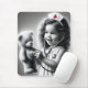 Ein junges Mädchen mit lockigen Haaren und ein Hut der Krankenschwester verwendet spielerisch ein Stethoskop, um den Herzschlag eines Teddybären Karo.