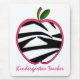 Ein Kindergärtneringeschenk, das eine Illustration eines Zebradruckapfels mit rosa Ordnung kennzeichnet. Rosa Text unter Apfel sagt "Kindergärtnerin." Suchen Sie nach diesem Entwurf auf anderen Einzelteilen am rosa Schulhaus.