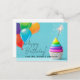 Herzlichen Glückwunsch zum Geburtstag mit dieser personalisierten Postkarte. Geburtstagskupkuchen mit Ballons und Drehbuch und moderner Schrift. Leere eine Postkarte zurück, um eine Notiz zu schreiben.