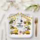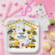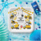 Kinderbau Geburtstagsparty-Teller mit einem schlichten, weißen Hintergrund, mit niedlichen Cartoon-Illustrationen von Bundings, Stoppschildern, einem Müllwagen, einem Bagger, einem Zementwagen, einem Kugelkran, Spritzern von Schmutz und einer leicht zu personalisierenden Geburtstagsvorlage.