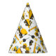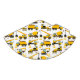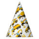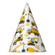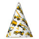 Geburtstagshütten aus dem Baugewerbe mit weißem Hintergrund, mit niedlichen Cartoon-Illustrationen zum Bollen, Stoppschildern, einem Müllwagen, einem Bagger, einem Kugelkran und Spritzern von Schmutz.