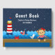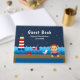 Dieses niedliche und lustige Gästebuch beinhaltet einen Seemann auf einem Holzdeck mit Seemannsrudel und Krabbe. Im Hintergrund befindet sich ein roter und weißer Leuchtturm, ein niedlicher Vogel auf einem Segelboot, Meereswellen und ein marineblauer Sternenhimmel. Der Text verbindet fett- und serifenlose Schriftart für ein stilvolles und modernes Aussehen. Das ist ideal für eine Babydusche zum Thema Wassersport.