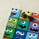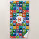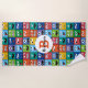 Kinder Monster Gesicht Muster farbenfrohe Monogram Beach Handtuch. Personalisierte und Monogramm mit Namen und entweder erste oder letzte Initial- Albernen mit Augen und zwei mit Augen Monster mit scharfen Zähnen in verschiedenen Farben in wiederholten Mustern.www.SamAnnDesigns.com