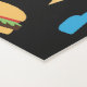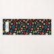 Kinderpersonalisierte Videospieltech-Party-Imbiss-Yoga-Matte. Muster mit Videospielprüfern, Kopfhörern, Schaumgummiringen, Eiscreme, Pizza, Burgern und Fischrogen auf einem schwarzen Hintergrund. Personifizieren Sie mit Namen. Spaß Gamer und Nachtischmuster. www.SamAnnDesigns.com