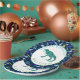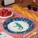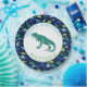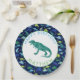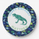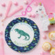 Kinderpersonalisierter Dinosaurier-Geburtstags-Party-Muster-Papier-Teller. Niedlicher Dinosaurier im Watercolor mit einem Hintergrund der Dinosaurier auf Blau. ALLES GUTE ZUM GEBURTSTAG und Name geschrieben in gebogenen Schriftart. www.SamAnnDesigns.com