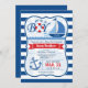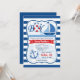 Das ist ein Junge! Nautic, Sailboat Thema Junge Dusche Einladung auf marineblau-blaue und weiße Streifen Muster. Das Segelschiff in dunkelblau und hellblau, das auf dem Wasser des Ozeans segelt, das rote und weiße Leben und der blaue Anker des Bootes. Die Farben sind Scharlachrot, Königsblau, Weiß und Himmelblau.
