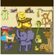 Kinderspielzeug im Kinderzimmer-Ornament-Skulptur von Kristie Hubler mit gestopften Tieren wie Teddybär, Giraffe, Affe, Elefant, Schaukelstuhl, Hobbypferd, LKW, Feuerwehrleder, Motor, Flugzeug, Bahn und Böcke, Hochstuhl, Layetteoutfit und Herzkissen mit dem Wort "Liebe" bestickt.