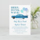 Niedliche Fahrt mit Babydusche Einladungskarte mit Illustration eines blauen Vintage-Autos mit Ballons. Im Text steht "piep honk wave". Ideal für einen Jungen, der durch die Dusche fährt, während er sich von der Gesellschaft distanziert.