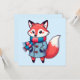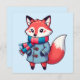 Das Bild zeigt einen stilisierten und reizenden Fuchs, der mit einem Mantel und einem Schal für den Winter gekleidet ist. Das Bild zeigt einen stilisierten roten Fuchs, der im Cartoon-Stil gemalt wird. Er hat große ausdrucksvolle Augen und eine niedliche Nase. Der Fuchs trägt einen hellblauen Mantel, der mit großen orangefarbenen Knöpfen zugeknöpft ist. Um den Hals ist ein roter und blauer, gestreifter Schal gebunden, dessen Enden in Streifen enden. Sein getufteter Schwanz ist rot und weiß, mit einer weißen Spitze. Der Stil ist süß und kindisch, mit klaren Konturen und vibrierenden Farben. Der Hintergrund ist schwarz, was den farbigen Fuchs aufzeigt. Die allgemeine Stimmung ist warm und angenehm, was auf ein Gefühl von Komfort und Kühnheit hindeutet.