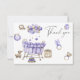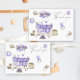 Die Einladung zeigt Aquarell, Babywickel, Kinderzimmer in Form lila Rundwolken, Kinderspielzeug: Nageelefant, Räderente, Teddybär, Hase, Bib, Schnuller, Pyramide.