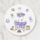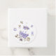 Die Einladung zeigt Aquarell, Babywickel, Kinderzimmer in Form lila Rundwolken, Kinderspielzeug: Nageelefant, Räderente, Teddybär, Hase, Bib, Schnuller, Pyramide.