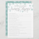 Testen Sie Ihre Babyduschgäste mit dieser niedlichen Spielkarte mit einem Schneeflottthema. Koordiniert mit unserer Babydusche "Baby ist kalt draußen". ANTWORTEN 1 AUSGABE DER PAPRIKASCHOTEN 2. BUTCHER BAKER KANDLESTICK MAKER 3. 4. EHEFRAU 5 des Bauern. GRAD 6.4 UND 20 7. TUFFET 8. CHRISTMAS PIE 9. HUNDE BONE 10. SILBER BELLS 11. EIN SCHWEIN 12. NACHTGOWN 13,3 BAGS ERFÜLLT 14. EIN PONY 15. NEUN TAGE 16. 17. FAT 18. IHRE MITTENS Hier finden Sie die komplette Babydusche-Kollektion zum Winterthema: