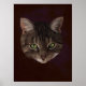 Ein digitales Portraitbild einer braunen Tabbatta-Katze auf einem gemalten, sehr dunkelrot-lila Hintergrund.