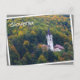 Postkarte einer von Bäumen umgebenen Kirche in Herbstfarben auf den Hügeln rund um den Bled Lake in Slowenien im Herbst mit weißem Rand und dem Text: "Slowenien". Es ist ein bisschen verdreht, um die Illusion zu schaffen, sich loszulegen.