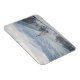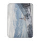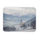Der rechteckige Foto-Magnet mit der St. Pankrazer Kirche in einer schneebedeckten Bergkulisse, umgeben von Wolken und Nebel auf einem Hügel mit Blick auf das Zillertal mit den Alpen im Hintergrund in Fügen, Österreich im Winter.