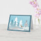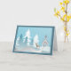 Illustrierte Urlaubskarte mit Kirche, Bäumen, Schnee und Reh.