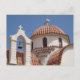 Architekturfotografie aufgenommen auf Kreta, Griechenland. Ein landschaftlicher Blick auf eine Kirchenoberseite mit Glocke und Kuppeldach, hinter dem sich ein blauer wolkenloser Himmel befindet. Eine hübsche Kirchenpost-Karte, ob Sie religiös sind oder nicht.
